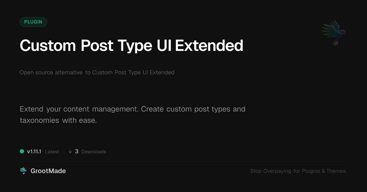| Tags | content organization, site structure, custom post types, WP development, developer content tools, CMS extension, content structure plugin, custom post type registration, custom taxonomy management, php script repository, gallery plugin development, Developer Tools, Post Types, Taxonomies, Cptui, content management, admin interface, profile tab builder, member communication plugin, user role visibility |