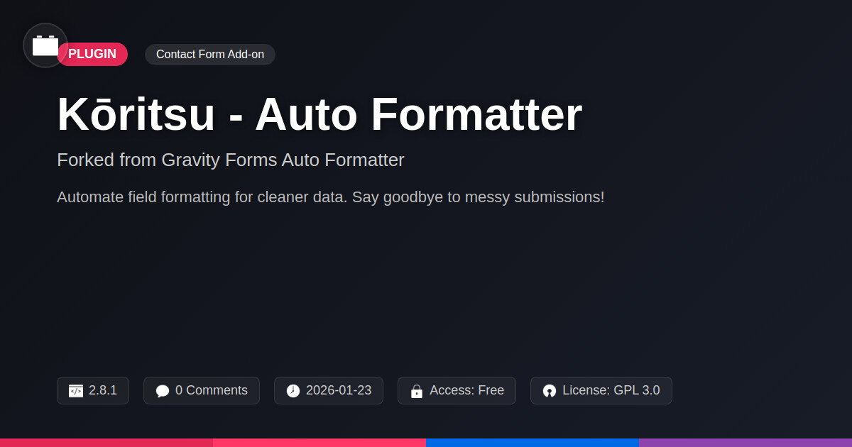 | Tags | content optimization, web form enhancement, auto clean form entries, data validation tool, form data formatter, input field formatting, php script repository, gallery plugin development, Productivity, Developer Tools, Workflow, Text Editing, Post Editing, Auto Formatter, Formatting Tools, automation, recent profile visitors, Content Formatting, member communication plugin, user contact form |