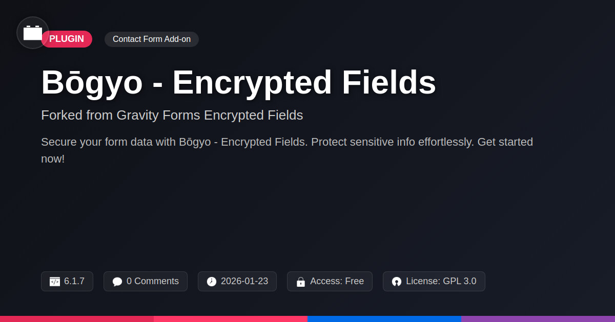 | Tags | form security, secure forms, data protection, data privacy plugin, encrypted form fields, form field encryption, secure data submission, sensitive data protection, search enhancement tool, Security, Encryption, Gravityforms, Formbuilder, Sensitive Data, Encryption Plugin, privacy, pagination addon, profile tab builder |
