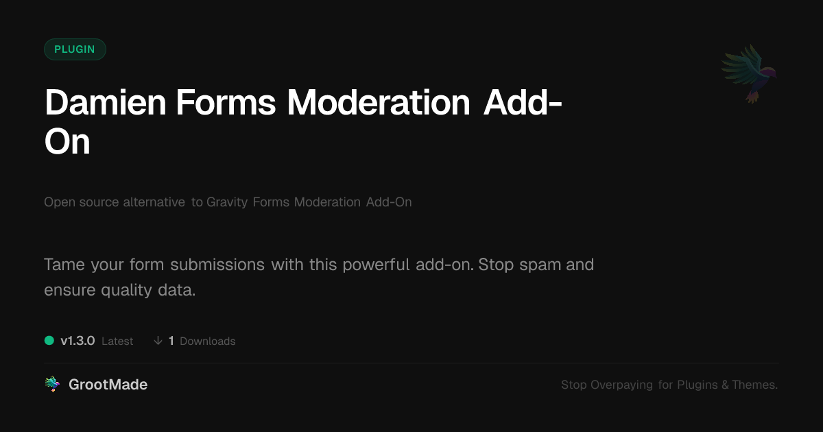 | Tags | Form Moderation, form submission, Content Moderation, form submission moderation, data quality control, form management, Approval Workflow, user contact form, profile tab builder, user submissions, user moderation, member communication plugin, anti-spam for forms, pagination addon, admin tools, content approval workflow, form security, Moderation Tools, form validation tool |