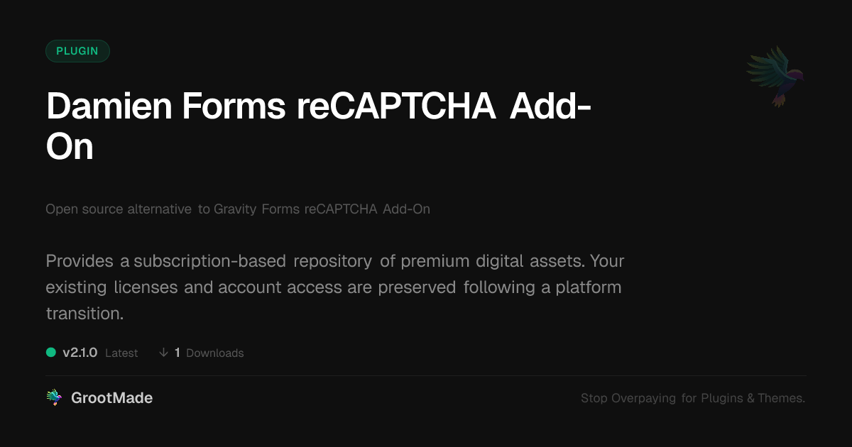 | Tags | contact form, anti-spam, CAPTCHA, Recaptcha, bot protection, open source forms, Validation, Security, user contact form, captcha integration, Digital Downloads, clean shop design, profile tab builder, member communication plugin, pagination addon, help desk plugin, Spam, content accessibility tool, Protection, form security, Forms, form builder |