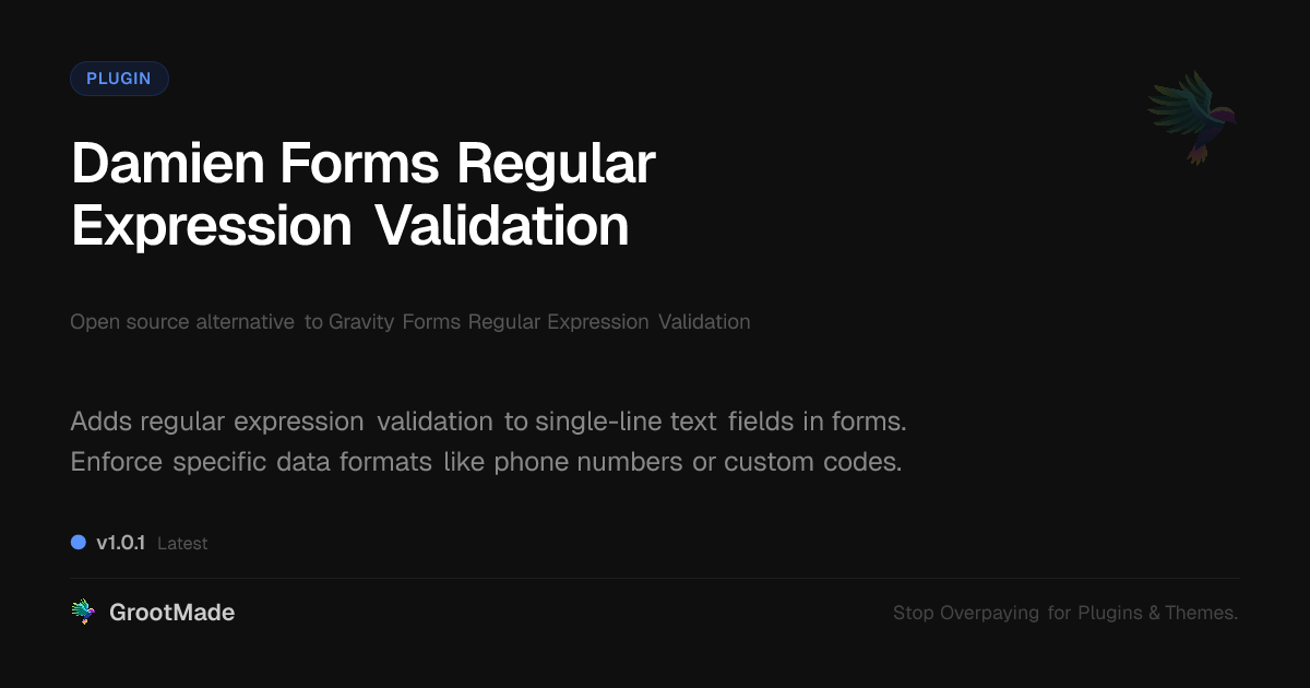 GrootMade is not affiliated with Gravity Forms Regular Expression Validation and provides an open-source alternative.