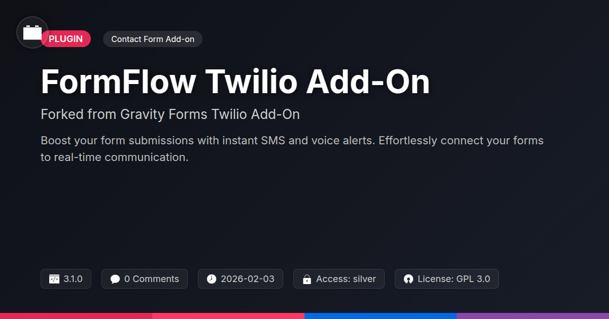 | Tags | form notifications, messaging api, sms alerts, voice broadcasts, image migration plugin, content accessibility tool, full screen theme, Notifications, Forms, Communication, Messaging, Sms, Twilio, lead generation, automation, contact forms, Digital Downloads, user contact form, clean shop design, pagination addon, user role visibility, profile tab builder, marketing |