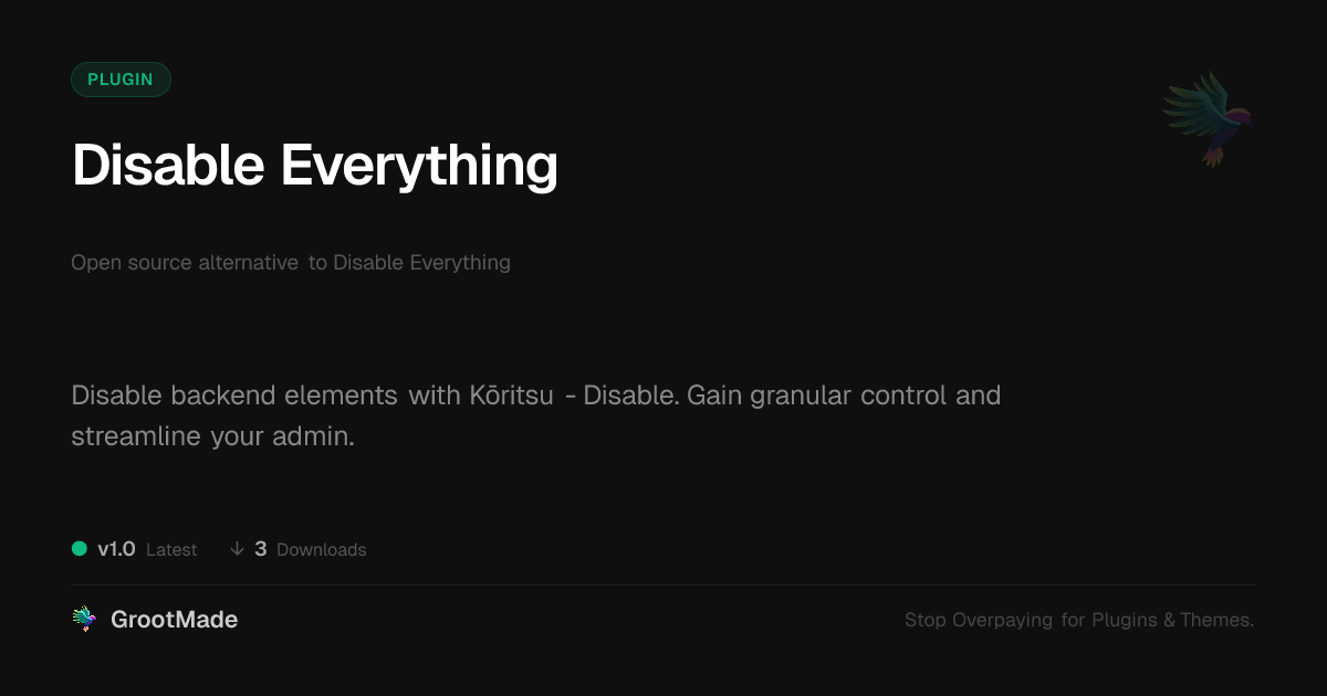| Tags | site management, frontend control, developer, backend customization, disable admin menu, security hardening, WP community tools, form to download link, image copyright tool, visual asset security, cms financial tool, Tools, Optimization, Admin, Speed, Security, Maintenance, Cleanup, Disable, performance, digital identity control, recent profile visitors, profile tab builder, user role visibility |