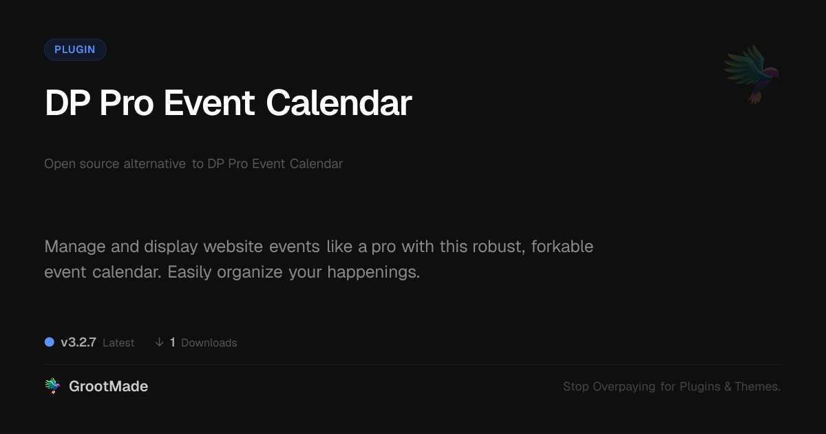 GrootMade is not affiliated with DP Pro Event Calendar and provides an open-source alternative.