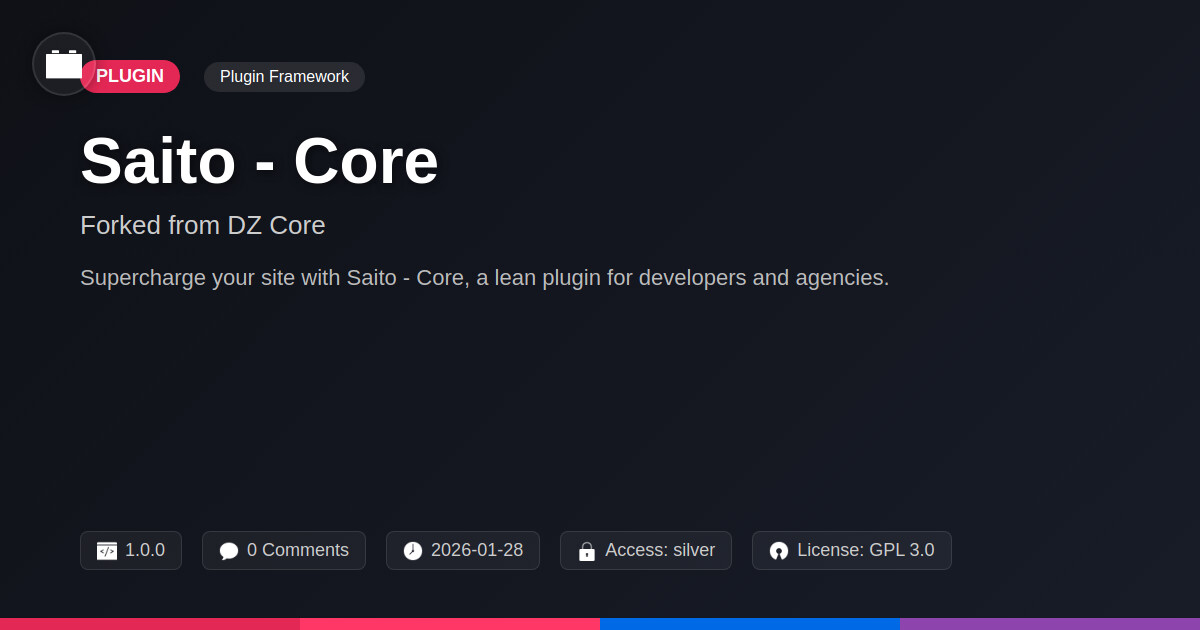 | Tags | website development, customization, open source core, customization toolkit, framework, development, gallery plugin development, image metadata display, Api, Developer Tools, Backend, Core, Foundation, Modular, Extensibility, theme framework, Digital Downloads, profile tab builder, member communication plugin, user role visibility, user contact form |