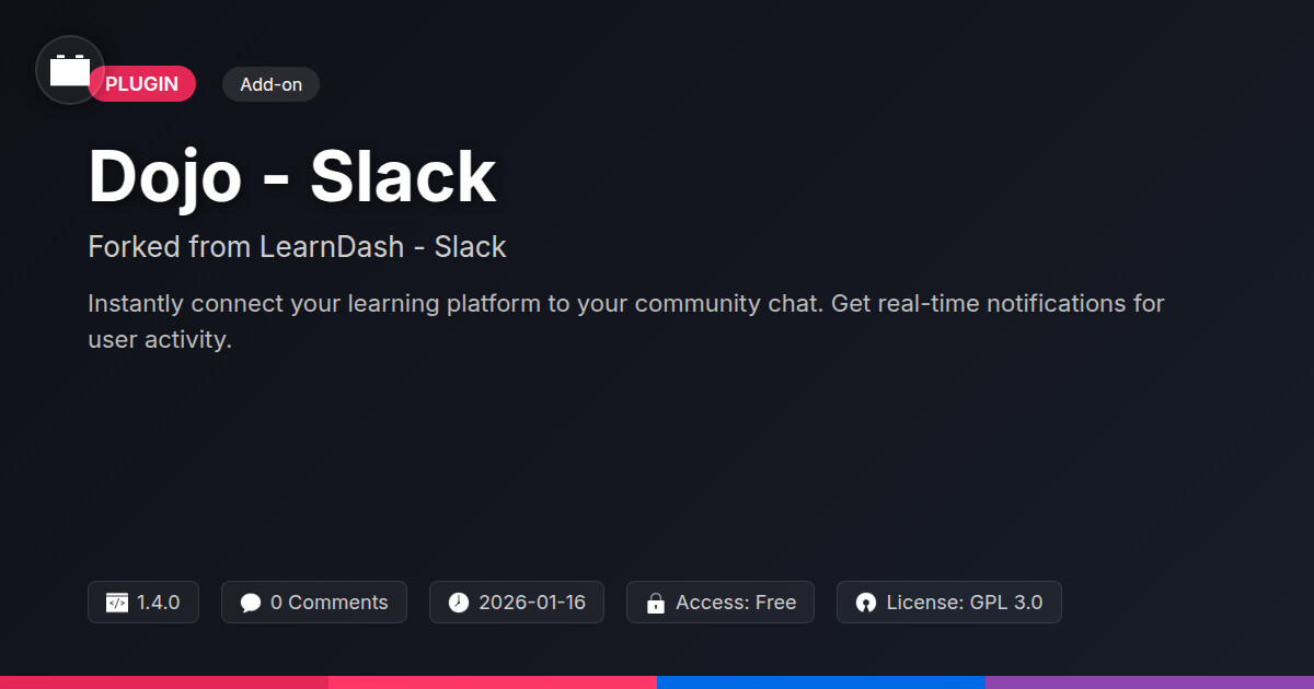 | Tags | course management, community notification plugin, learning platform integration, online course communication, real-time updates, user activity alerts, education, product roadmap, visual showcase plugins, image migration plugin, full screen theme, template builder add-on, post management tool, Elearning, Productivity, Slack, Notifications, Communication, Learndash, automation, integration, film gallery plugin, classifieds tool |