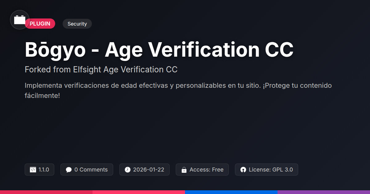| Tags | age gate, age restriction, content control, age verification, age verification plugin, alcohol age check, gambling age verification, website age gate, Legal, Adult Content, Age Check, Alcohol, Tobacco, digital identity control, content restriction, Compliance, WC, Ecommerce |