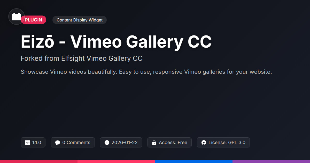 | Tags | gallery, showcase, website video, embed video, video widget, Vimeo gallery, playlist, WP community tools, software beta testing, product likes plugin, morphing animations, Video, Media, Vimeo, Content, Embed, Display, Shortcode, digital identity control, online community safety, responsive gallery, profile tab builder, downloadable product plugin, user contact form |