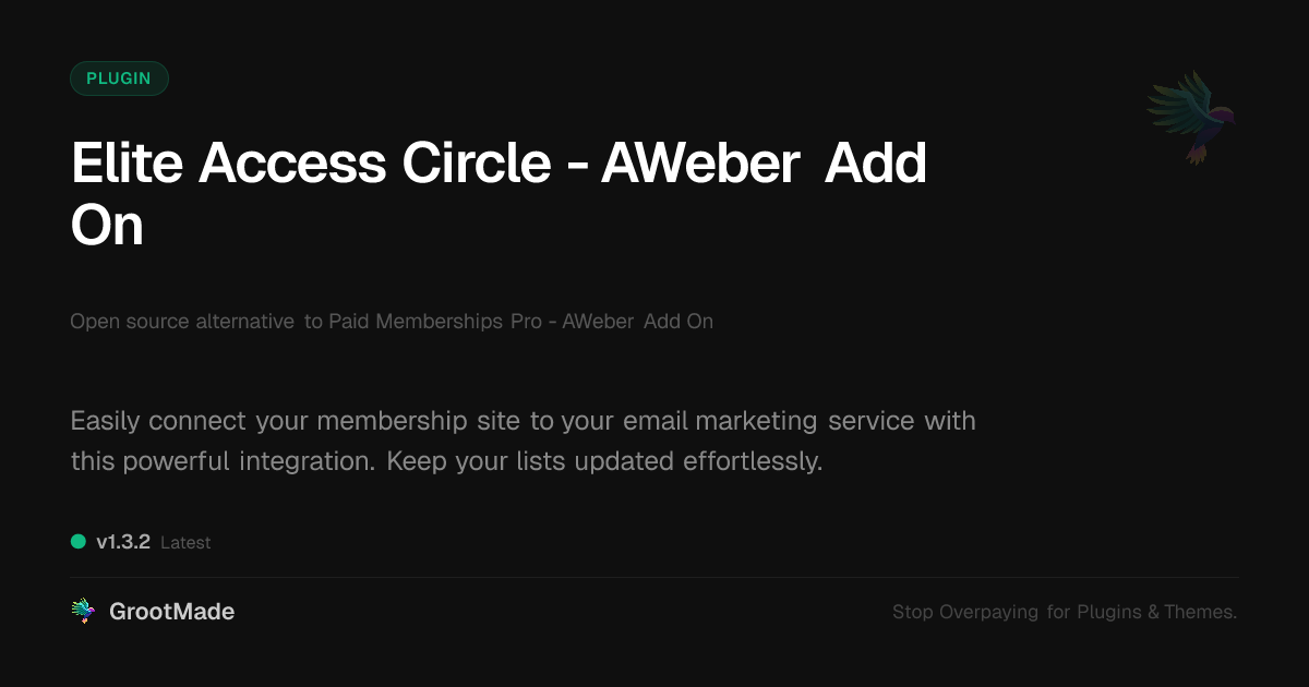 | Tags | Subscriptions, Membership, site automation, email marketing, email integration, membership marketing, marketing add-on, member sync, mailing list, payment status, digital shop template, responsive e-commerce, Paid Memberships Pro, Aweber, Newsletters, automation, marketing tools, digital identity control, profile tab builder, integration, user role visibility |
