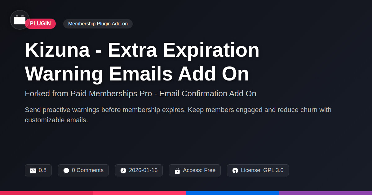 | Tags | Membership, email verification, user registration, customer retention emails, member engagement tools, membership renewal reminders, proactive notifications, subscription expiration notices, digital shop template, Subscription, Paid Memberships Pro, Pmpro, Email Confirmation, Account Activation, Member Verification, user authentication, profile tab builder, design expansion pack, user role visibility |