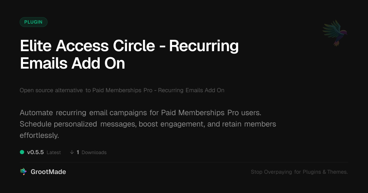 | Tags | Membership, email automation, email marketing, automated membership emails, member onboarding emails, recurring membership emails, subscription reminders plugin, drip campaigns, digital shop template, responsive e-commerce, Paid Memberships Pro, Newsletters, Subscription Emails, Pmpro, Recurring Emails, membership sites, profile tab builder, user role visibility, membership renewal notifications |