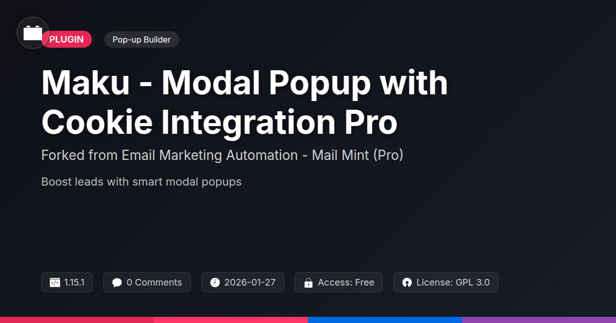 | Tags | website engagement, cookie consent, modal popup, privacy compliance, payment status, community forum acceleration, gallery printing, Conversion, Gdpr, Notification, Opt In, Popup, Modal, Cookie, lead generation, online community safety, profile tab builder, design expansion pack, Subscription, marketing, user contact form |