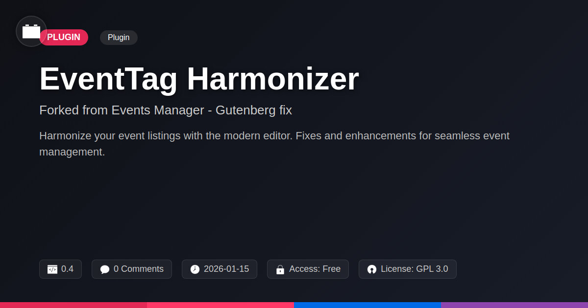 | Tags | open source events, gutenberg compatibility, data visualization tools, Compatibility, WP, user role visibility, Updates, developer tools plugin, plugin, Fixes, event listing plugin, Events, user contact form, profile tab builder, Blocks, WP event fix, digital identity control, Editor, content spotlight plugin, gutenberg, event management, event management plugin |