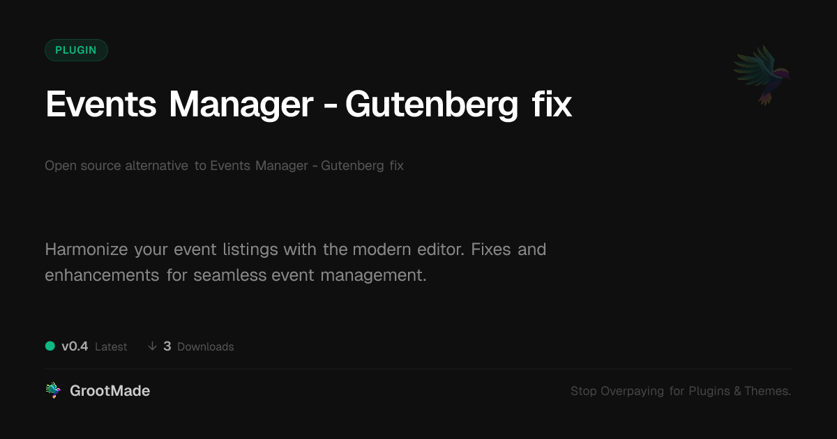 GrootMade is not affiliated with Events Manager - Gutenberg fix and provides an open-source alternative.