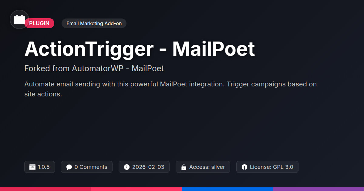 | Tags | WP email integration, Triggers, Workflows, email trigger plugin, marketing automation, Actions, email marketing, mailpoet automation, Mailpoet, gallery themes, automation, automation tools, integration, Newsletters, payment status, digital identity control, automlized email campaigns, site action email |