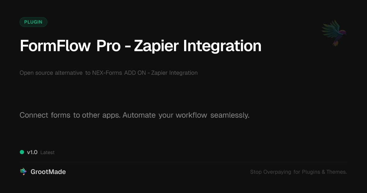 | Tags | workflow automation, form automation, form integration, data integration, form submissions, dev tools, app connector, image sharing plugin, image metadata display, Zapier, Api, Workflow, Nex Forms, lead generation, webhooks, pagination addon, profile tab builder, form builder, user role visibility, user contact form, member communication plugin, automation |