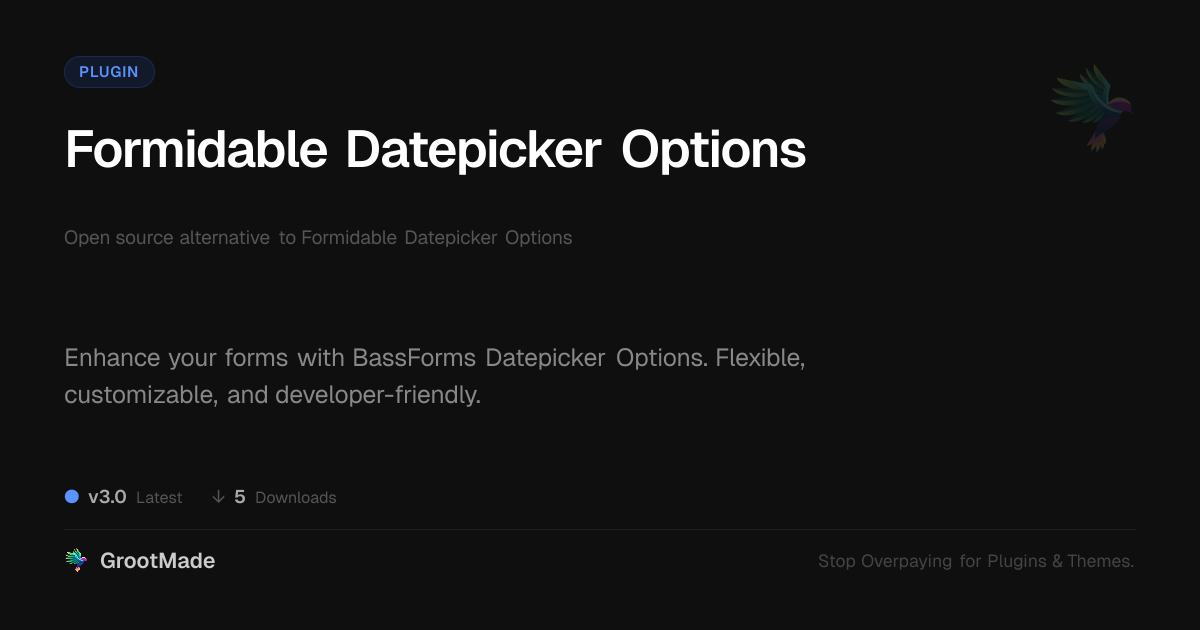GrootMade is not affiliated with Formidable Datepicker Options and provides an open-source alternative.