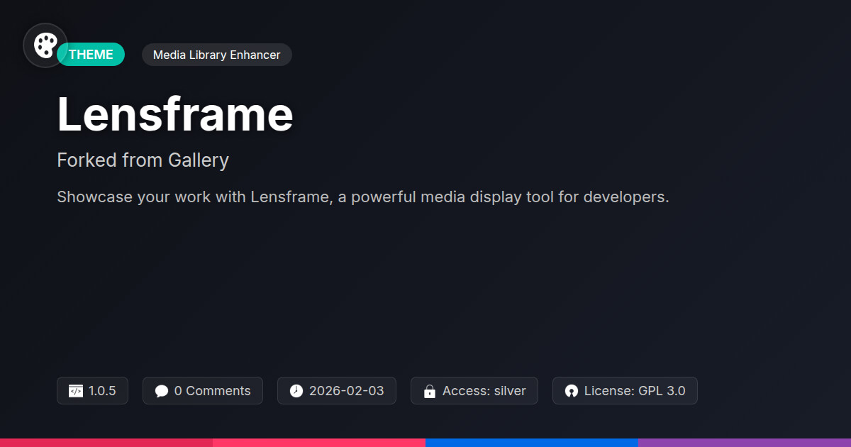 | Tags | visual presentation, Media Display, gallery, photography, theming, multilingual translation, Images, Visual, Lightbox, open source, online community safety, Digital Downloads, downloadable product plugin, member communication plugin, Minimalist, portfolio, creative, modern, responsive, WP community tools |