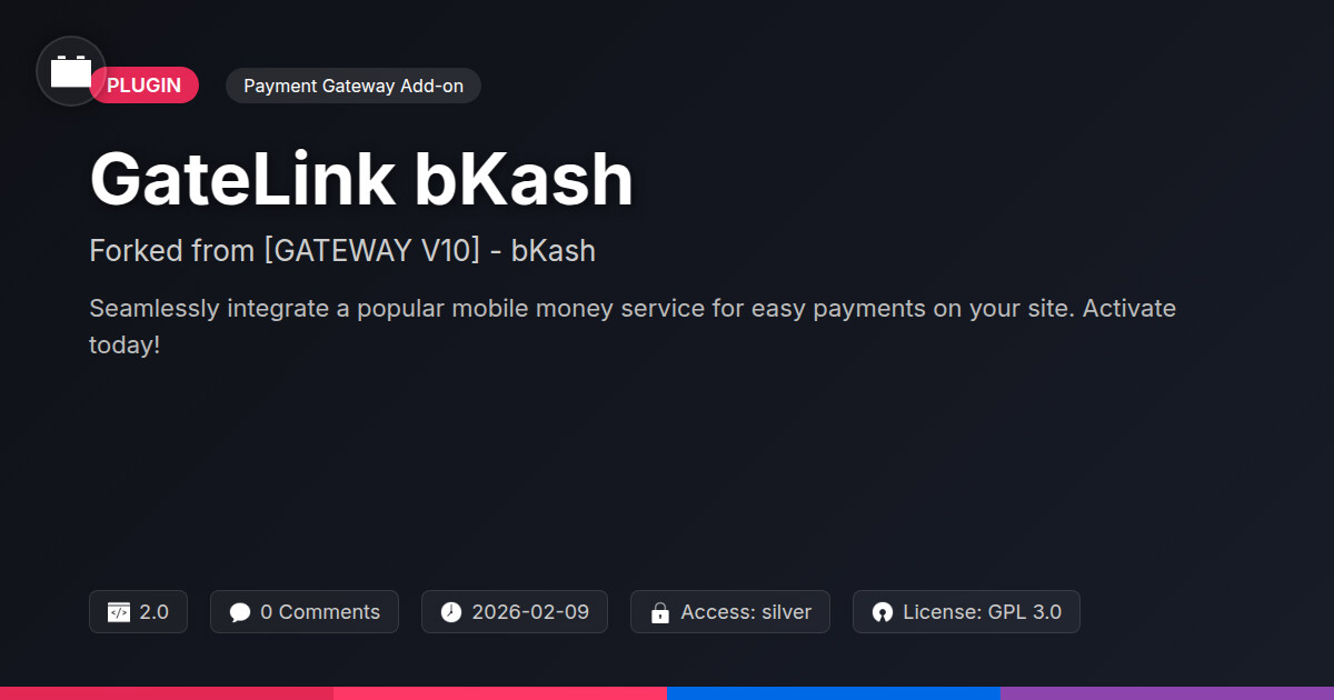 | Tags | digital wallet, agency checkout solution, bKash payment gateway for opensource, developer payment extension, mobile financial service integration, popular payment gateway add-on, Transaction, Bkash, Bangladesh, Mobile Payment, Payment Gateway, data tracking software, Checkout, Online Payments, online community safety, member profile enhancements, WC, profile tab builder, Ecommerce, user role visibility, user contact form, member communication plugin |