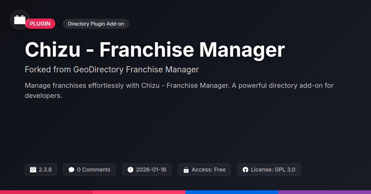 | Tags | Business Directory, directory comparison, multi location directory, Multi Location, user role visibility, franchise management plugin, Franchise Management, user contact form, Digital Downloads, Business Locations, business listings, Franchise Directory, Geodirectory, open-source directory, online community safety, directory, Location Manager, Franchise, directory addon |
