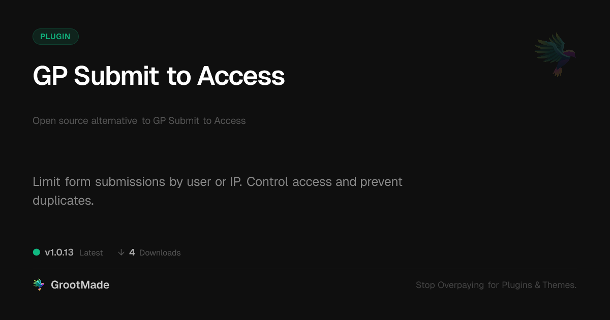 | Tags | restricted content, user submission control, access control, User Submission, Membership, user role visibility, Paywall, Login, user contact form, prevent duplicate entries, profile tab builder, content access, premium content, member communication plugin, Subscription, form submission limit, html framework, access control forms, digital identity control, design expansion pack, online community safety, form anti-spam, deal finder plugin, gated content |