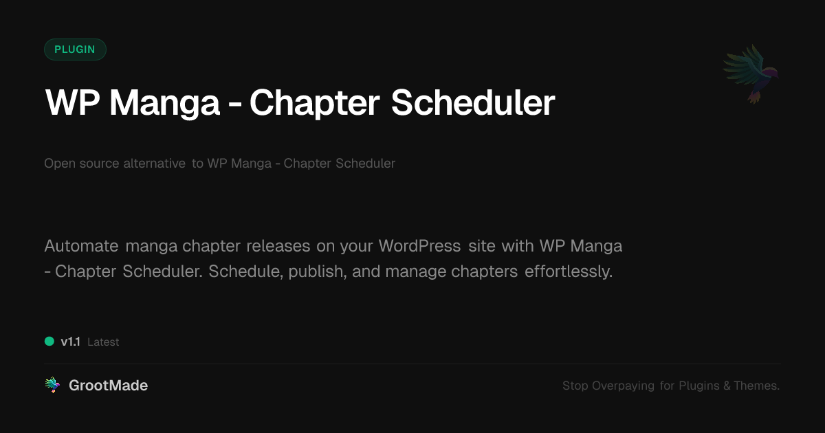 | Tags | content automation, content scheduling, content planner, dynamic content builder, Publishing, Manga, Manga Management, Chapter Scheduler, Wp Manga, Manga Plugin, digital identity control, WP plugin, downloadable product plugin |