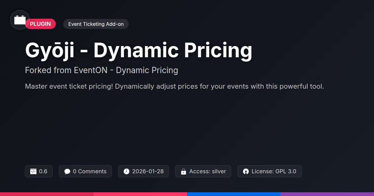 | Tags | variable pricing, online store, dynamic pricing, event revenue optimization, event ticket pricing, flexible ticketing, ticket price automation, Discounts, Smart Pricing, Sales Strategy, product pricing, Pricing Rules, product metadata indexing, theme architecture, member profile enhancements, WC, Ecommerce |
