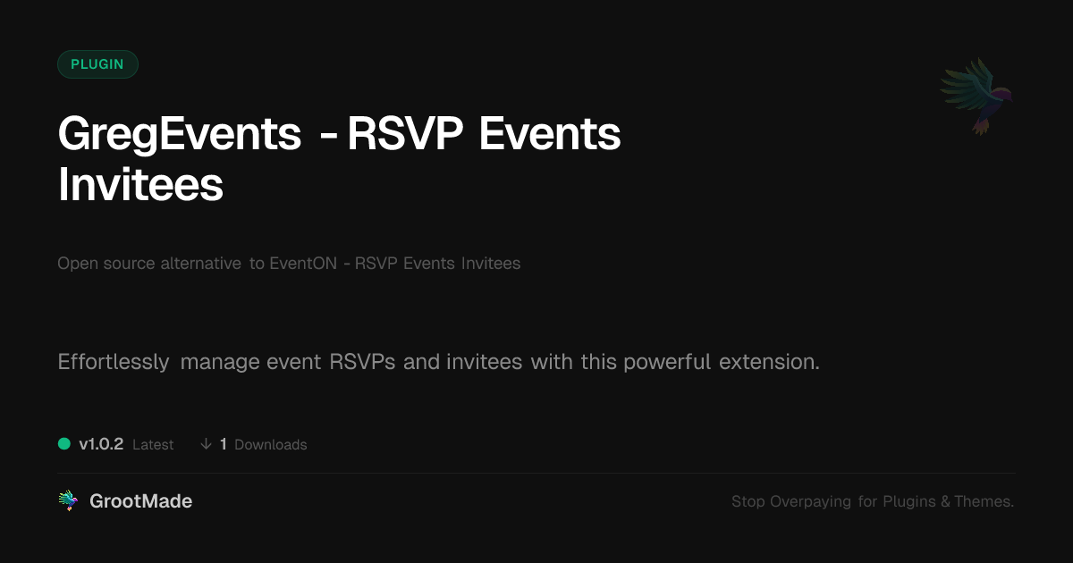 | Tags | Guest List, event rsvp manager, event registration, data visualization tools, event planner, developer tools plugin, event guest list, invitee tracking, Rsvp, Events, user contact form, dynamic web elements, event notification system, profile tab builder, ticketing alternative, Ticketing, custom admin login, online community safety, event management, Invitations, Attendees, Calendar |