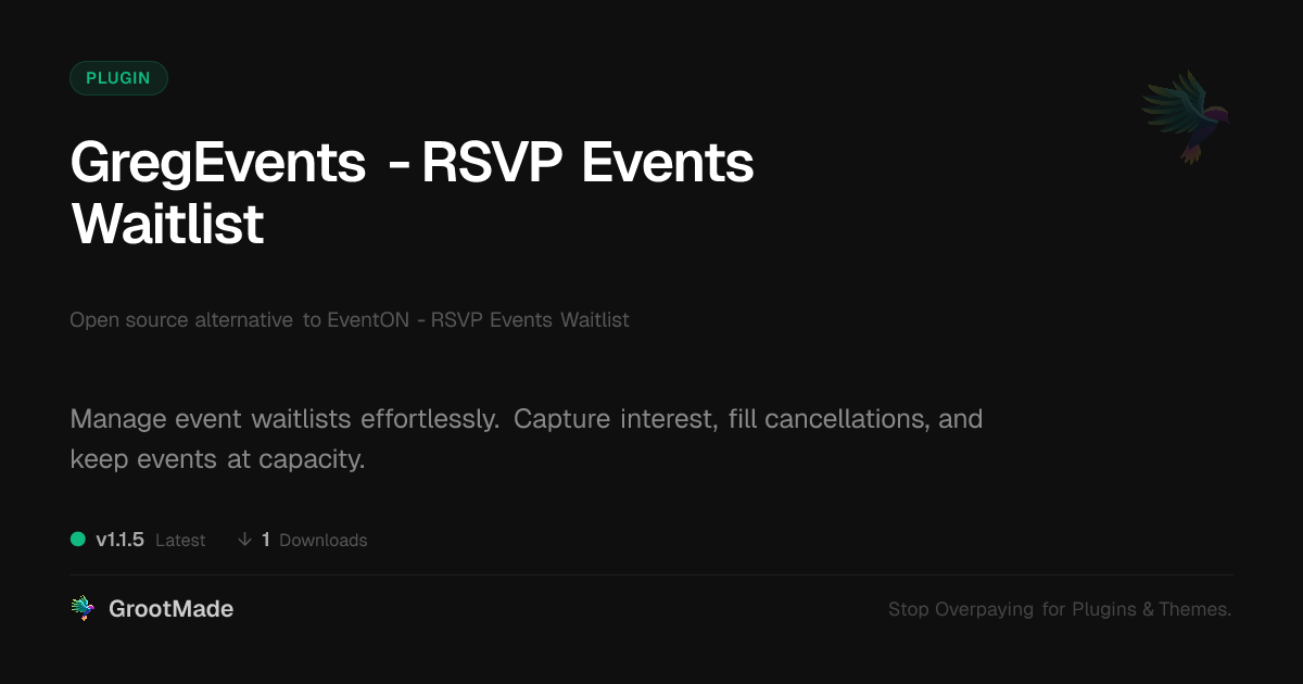 | Tags | event registration, waitlist plugin, data visualization tools, Eventon, attendee management, developer tools plugin, Event Planning, Event Organizer, Reservations, Rsvp, Events, user contact form, event attendee list, rsvp extension, profile tab builder, visual promotion addon, digital identity control, open source event tool, content spotlight plugin, Waitlist, event management |