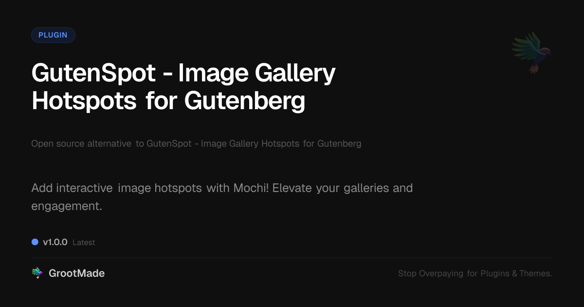 GrootMade is not affiliated with GutenSpot - Image Gallery Hotspots for Gutenberg and provides an open-source alternative.