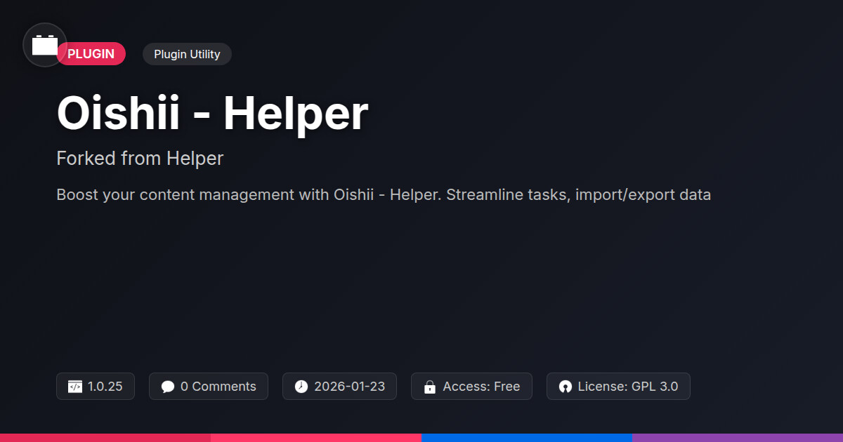 | Tags | data import export, site utility, form to download link, photo security addon, site discount management, Dashboard, Productivity, Tools, Admin, Utility, Workflow, Efficiency, Shortcuts, Helpers, automation, digital identity control, content management, website efficiency, Digital Downloads, profile tab builder, member communication plugin, user role visibility, user contact form |