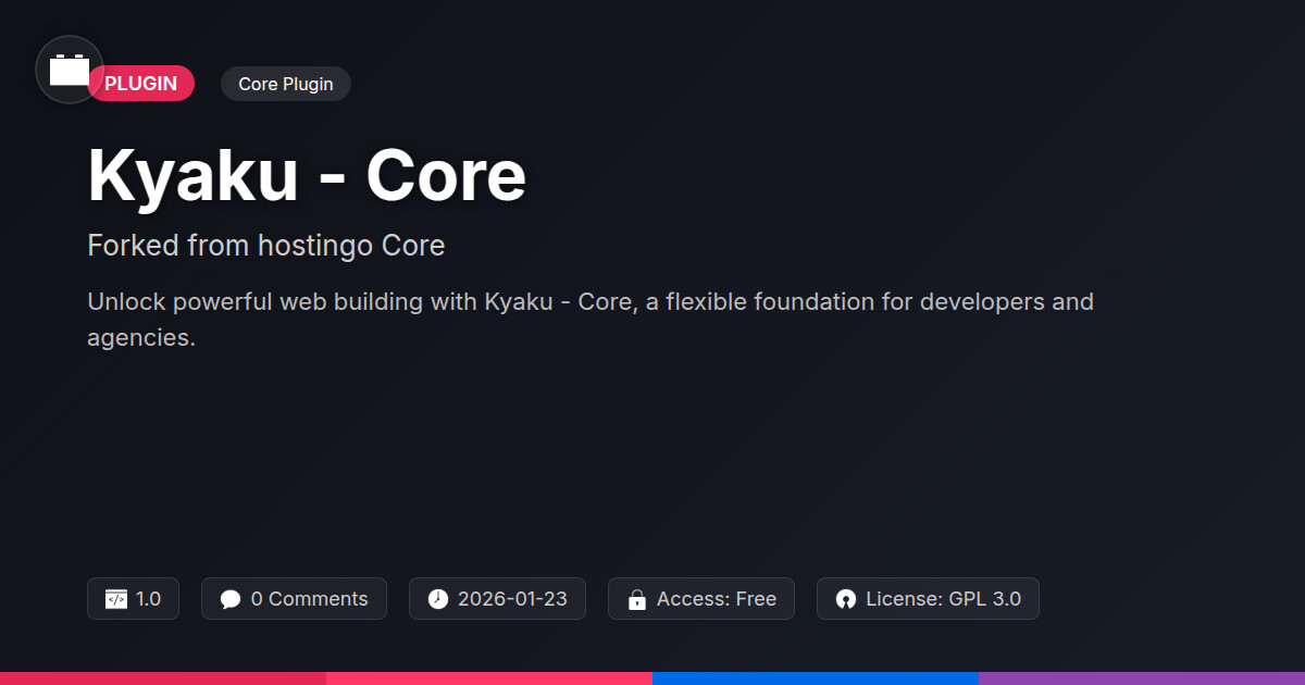 | Tags | agency solutions, php framework, core plugin, developer, open source foundation, form to download link, visual asset security, Tools, Optimization, Hosting, Server, Website, Core, performance, online community safety, Management, integration, user role visibility, user contact form, member communication plugin |
