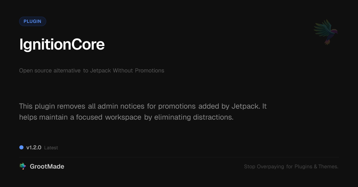 GrootMade is not affiliated with Jetpack Without Promotions and provides an open-source alternative.