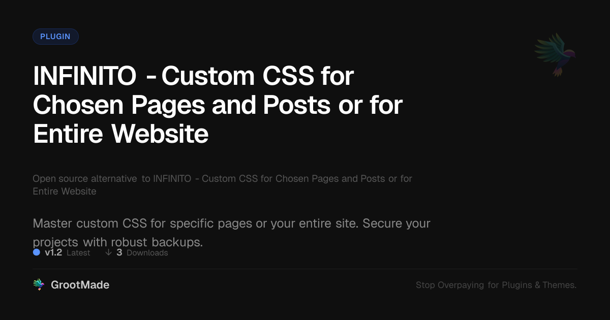 GrootMade is not affiliated with INFINITO - Custom CSS for Chosen Pages and Posts or for Entire Website and provides an open-source alternative.