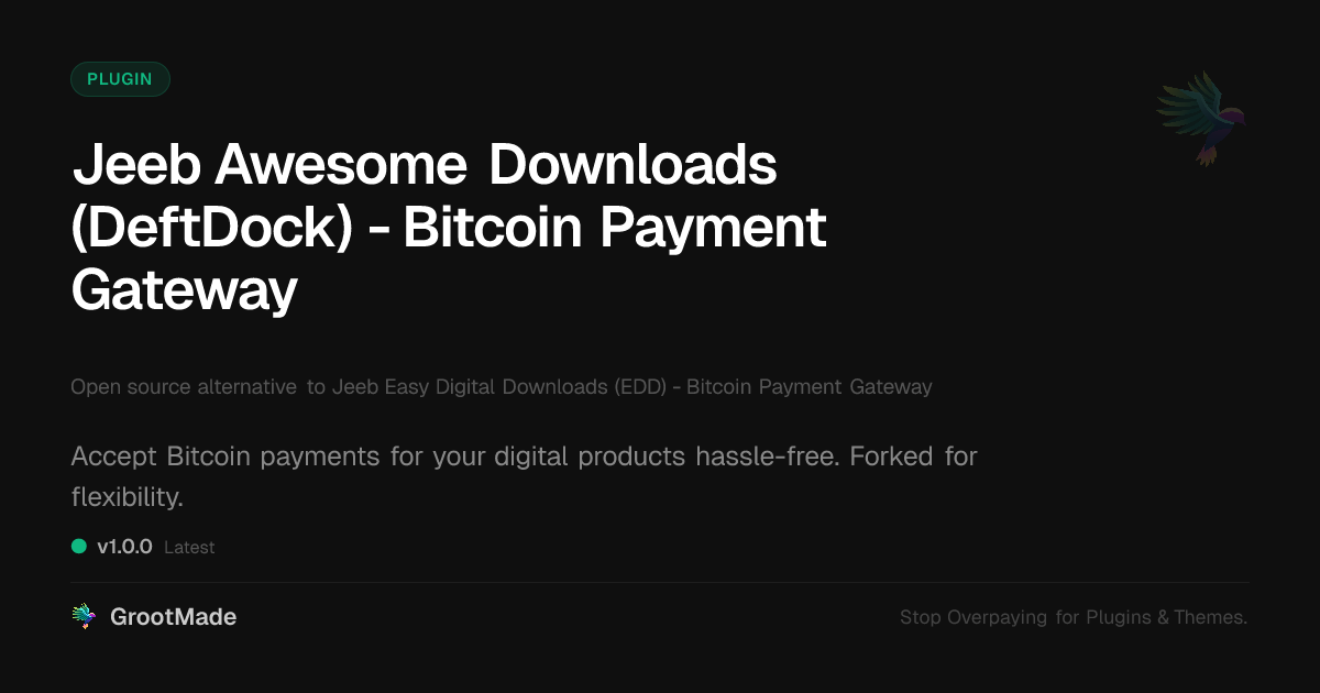 | Tags | digital products, publish scheduler, data tracking software, payment gateway plugin, WC, bitcoin payment gateway, customizable job listings, cryptocurrency payment, ecommerce, digital delivery, Cryptocurrency, Payment Gateway, Online Payments, Checkout, open source payment, crypto payments, analytics tracking, Bitcoin |