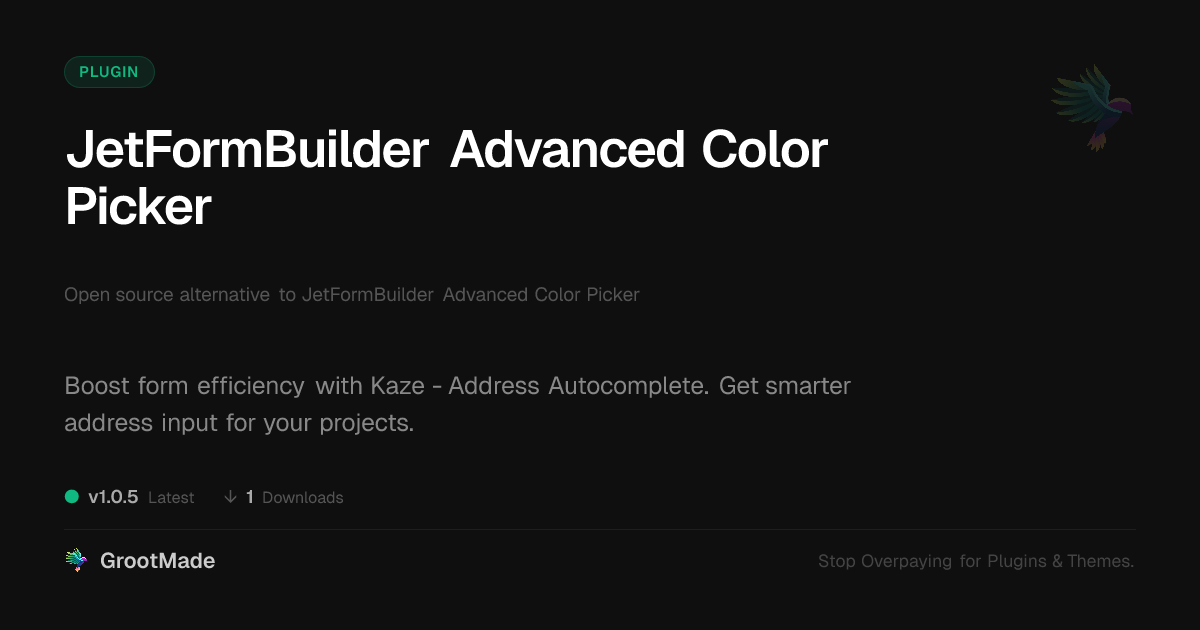| Tags | Color Selection, address autocomplete, advanced forms, custom forms, Color Picker, open source plugin, web form optimization, Digital Downloads, form fields, form field enhancement, form customization, member communication plugin, pagination addon, User Input, payment status, Jetformbuilder, web design, translation plugin add-on, form builder |