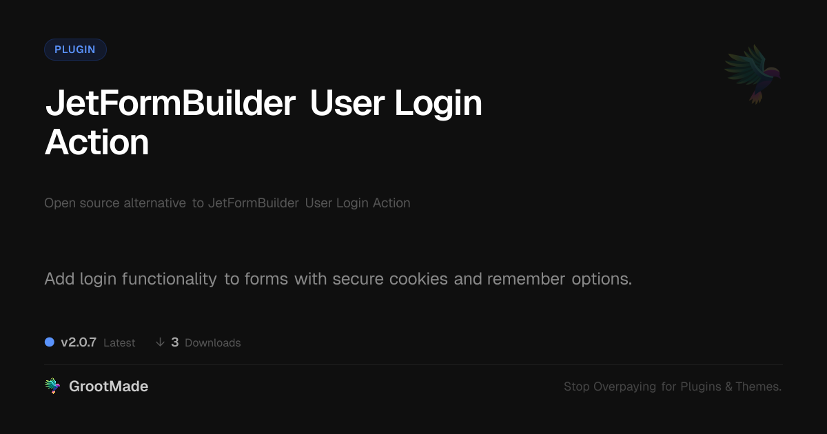 GrootMade is not affiliated with JetFormBuilder User Login Action and provides an open-source alternative.