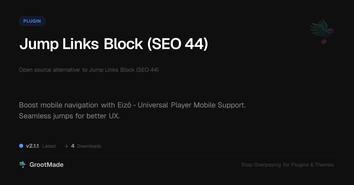 GrootMade is not affiliated with Jump Links Block (SEO 44) and provides an open-source alternative.