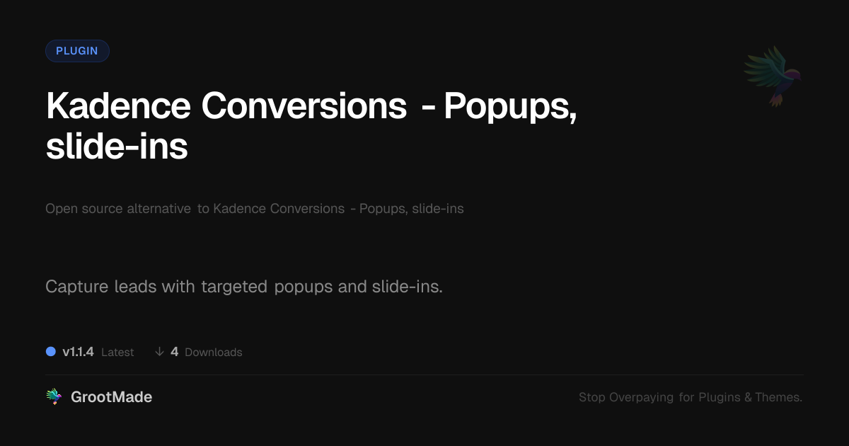 GrootMade is not affiliated with Kadence Conversions - Popups, slide-ins and provides an open-source alternative.