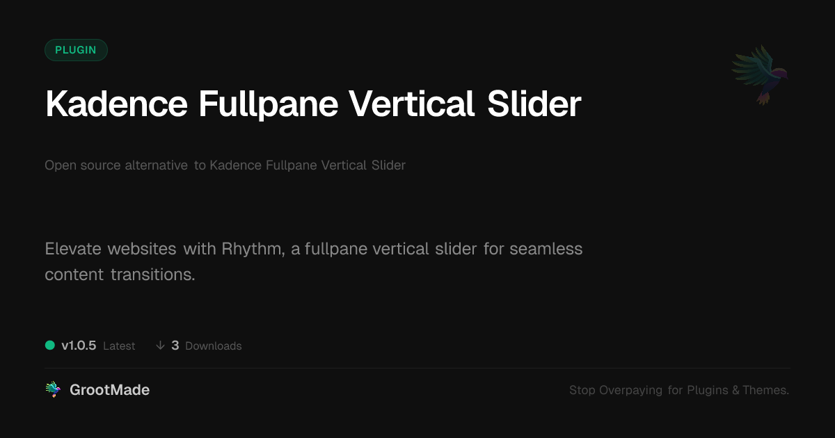 | Tags | directory comparison, vertical slider, One Page Navigation, WP community tools, website scroll, Kadence, user role visibility, page scrolling, Fullpage Slider, Scrolling, member communication plugin, responsive slider, full page plugin, web design, content presentation, user experience, Smooth Scrolling, page transitions |