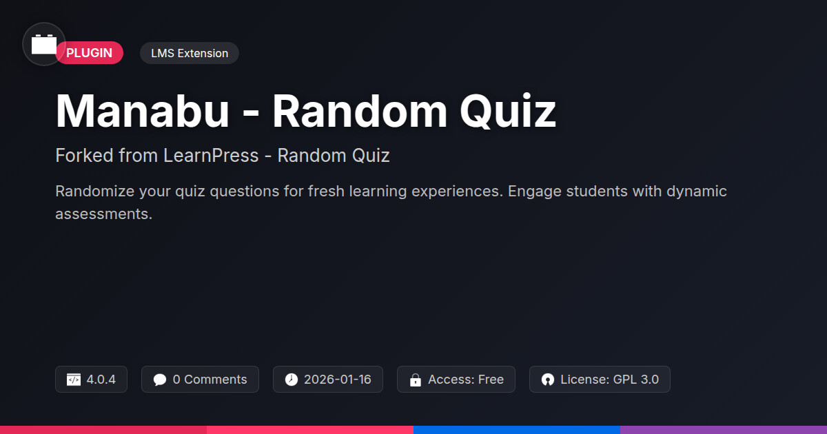 | Tags | online courses, assessment tool, educational plugin, lms quiz randomization, quiz generator, random quiz plugin, education, blog to product sales, whiteboard animation plugin, shop filters, Lms, E Learning, Quiz, Testing, Student Progress, Assessment, Randomization, Learnpress, digital identity control |