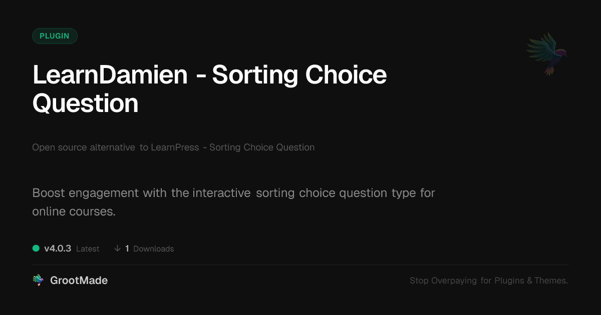 | Tags | educational technology, interactive quiz, learning management system add-on, online course assessment, student engagement tool, quiz builder, education, product roadmap, blog to product sales, whiteboard animation plugin, Learning, Elearning, Lms, Quiz, Assessment, Learnpress, Question, Sorting, online community safety, profile tab builder, user contact form |
