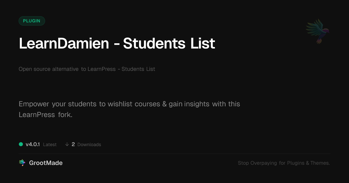 | Tags | Membership, online courses, education, elearning tools, course wishlist, learnpress fork, student insights, product roadmap, digital delivery tool, performance analysis, post management tool, Learning, Courses, Elearning, Student, Bookmarks, Wishlist, Study, digital identity control, online community safety, Digital Downloads, film gallery plugin, classifieds tool |