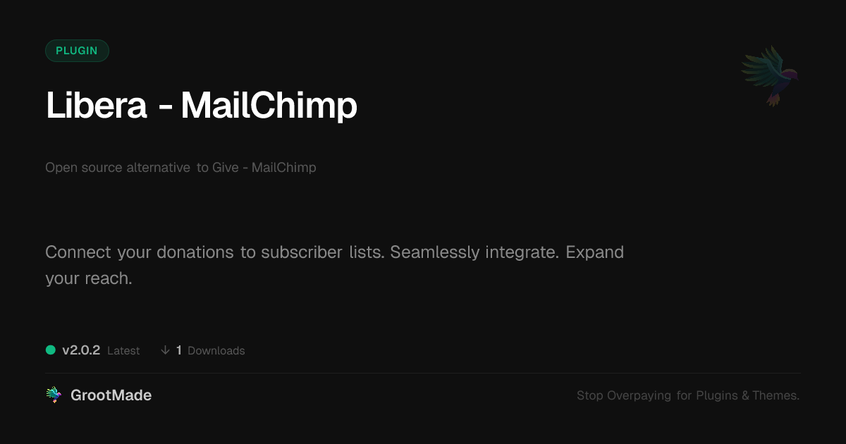 | Tags | Campaigns, donation form sync, email marketing, user role visibility, fundraising outreach, content management system addon, automation, email list integration, user contact form, clean shop design, profile tab builder, member communication plugin, Subscription, Mailchimp, integration, web design utility, design expansion pack, subscriber management, Newsletter, Audience, Forms, Leads, open source donation tool |