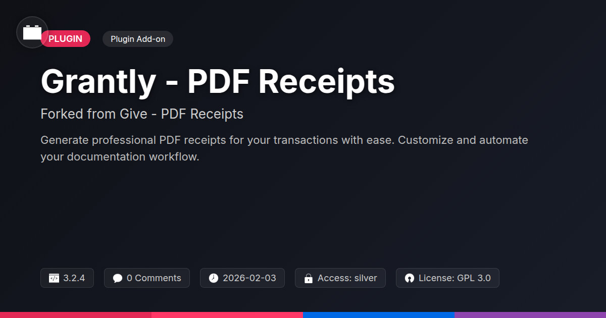 | Tags | pdf generation, customizable receipts, donation receipt plugin, transaction documentation, Fundraising, pdf receipt generator, donation management, Local Business, Payment Receipts, Digital Downloads, profile tab builder, Receipt Generator, Pdf Receipts, Donations, Givewp, Charity, Nonprofit |
