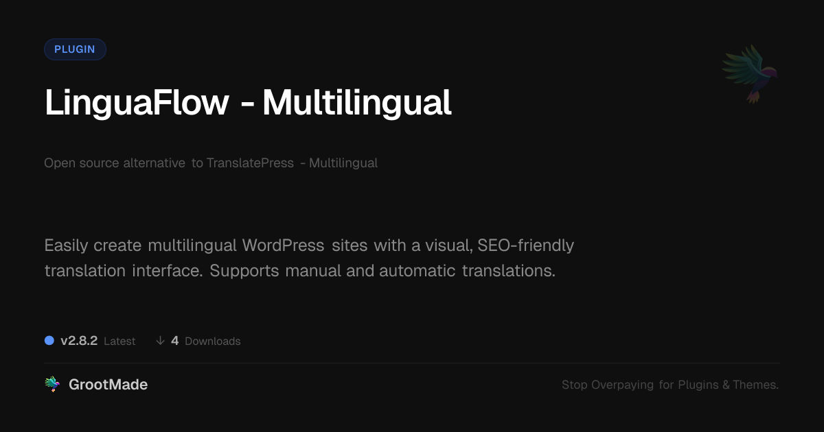 GrootMade is not affiliated with TranslatePress - Multilingual and provides an open-source alternative.