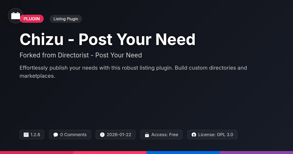 | Tags | customizable forms, directory plugin, post your need, project submission, request management, download forms, gallery discoverability, viral content theme, wp scheduler, print automation, Marketplace, Social, Listings, Classifieds, User Generated, Sharing, Requests, Posting, Needs, online community safety, directory comparison, profile tab builder, Community, member communication plugin, user role visibility |