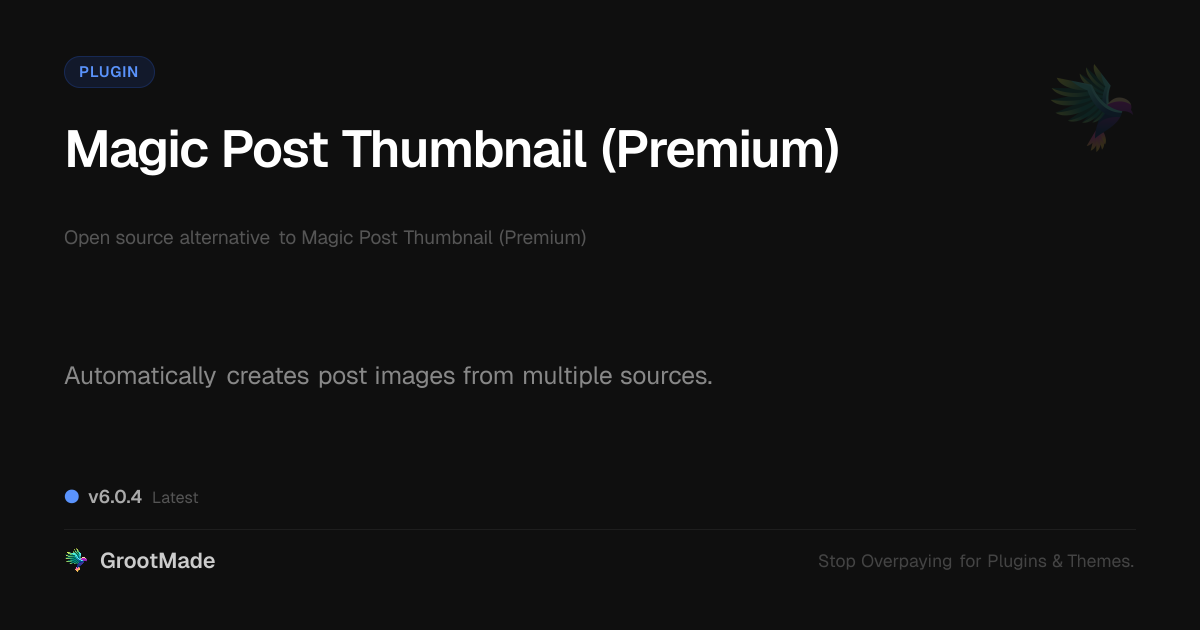 GrootMade is not affiliated with Magic Post Thumbnail (Premium) and provides an open-source alternative.