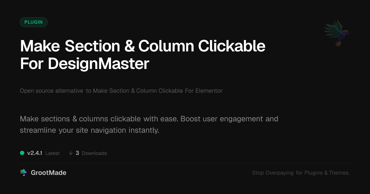 | Tags | clickable section, Clickable Sections, elementor addon, WP community tools, elementor, CTA buttons, user contact form, profile tab builder, user interaction, member communication plugin, link section, Designmaster, digital identity control, clickable column, website customization, frontend editing, Clickable Columns, web design, page builder, design tool |